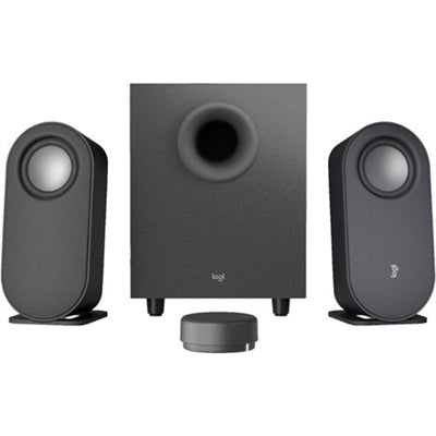 Logitech Z407 Bluetooth computer speakers with subwoofer and wireless control - gives you immersive sound, big bass, and clarity. Connect with Bluetooth, micro USB, and audio jack, and control with the wireless dial. IMMERSIVE SOUND - The expertly tuned 2.1 speaker system features 80 watts of peak power and 40-watt RMS. Digital signal processing offers a balanced sound profile and enhanced bass, so you hear everything across the sound spectrum. Experience immersive, lifelike sound?from crisp high notes to powerful mid and low-range notes?with no compromises on the rich, deep bass. STRONG BASS WITH CLARITY - 20-watt bass with digital signal processing produces deep yet clear bass and superior sound performance. The ported, down-firing subwoofer adds ?boom? to music, movies, and gaming while maintaining a rich, crisp sound. ONE DIAL FOR TOTAL WIRELESS CONTROL - With a 30 m line of sight range, the wireless control dial lets you adjust your sound from across the room. Tap it and spin it to play, pause, and mute?and control volume and bass. Do it all from the control dial. It?s easy, and you don?t even have to get off the couch. DUAL-POSITION SPEAKERS - Sleek, oval-shaped satellite speakers come in a refined graphite gray. Lay them vertically or horizontally. Move and curate to fit your aesthetic preference. MULTIPLE WAYS TO CONNECT AND SWITCH - You?ve got options. Connect up to three devices via Bluetooth, micro USB, and the 3.5 mm input. The source selection button on the bottom of the dial switches between wired (3.5 mm and micro USB) connections. Quickly switch back to Bluetooth by pressing the Bluetooth button.